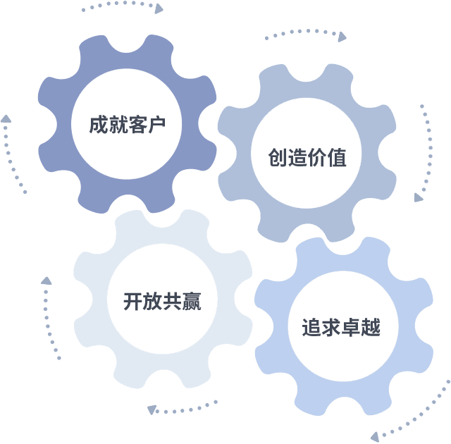 成就客户是一切决策的出发点,,,创造价值是衡量所有工作的标准,,追求卓越是我们做事做人的态度,,开放共赢是我们的格局也是最终的结果。。。。价值观的齿轮环环相扣,,推动着组织里的每个人不断向前。。。。